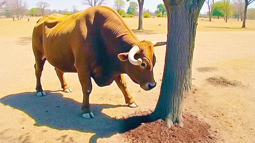 Initially, the owner of this bull felt relieved after finally finding his animal. The big male animal had escaped somewhere during the night. And was now nudging this tree repeatedly.