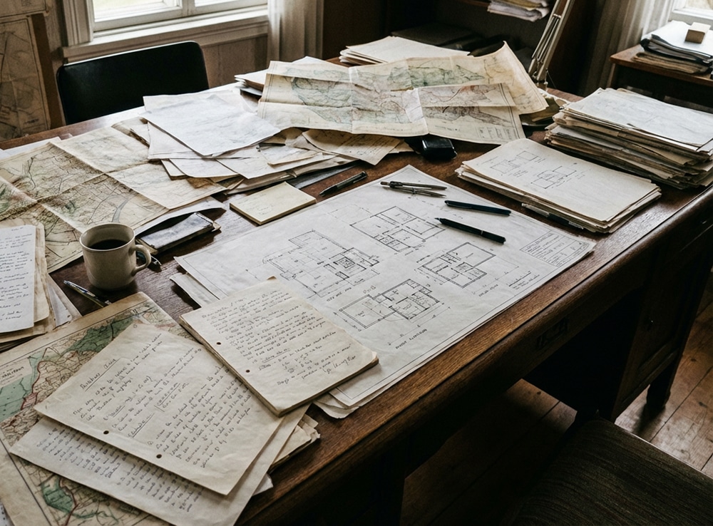 Inside, they found a table covered in papers, maps, and diagrams, all of which pointed to some secret operation.