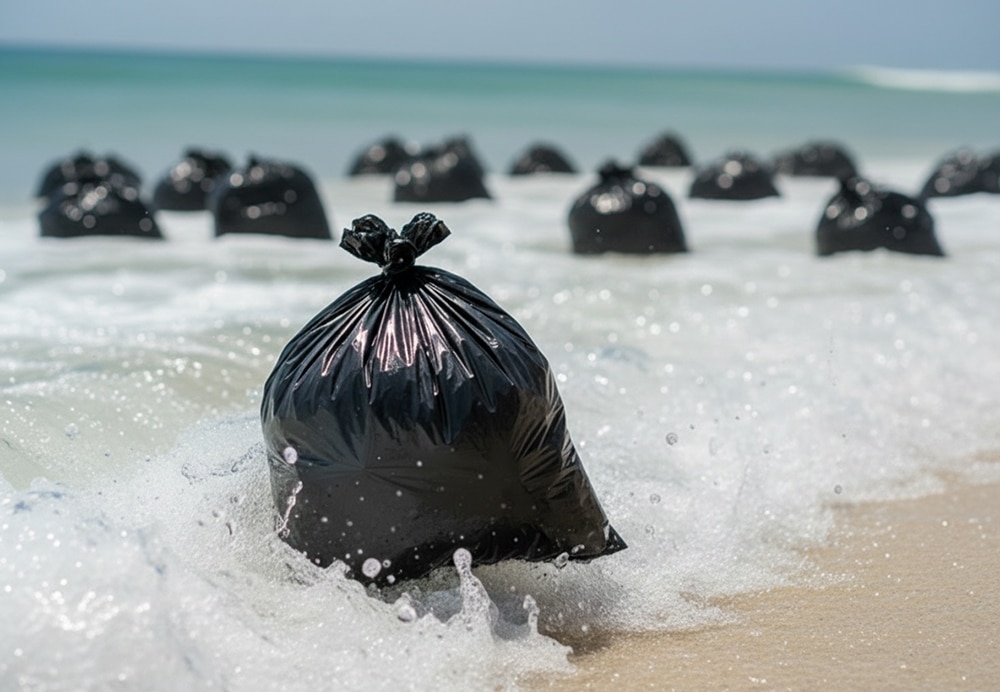 As more bags floated up, the team started to gather them into piles further from the water. The odd weight of each bag made the task slow.