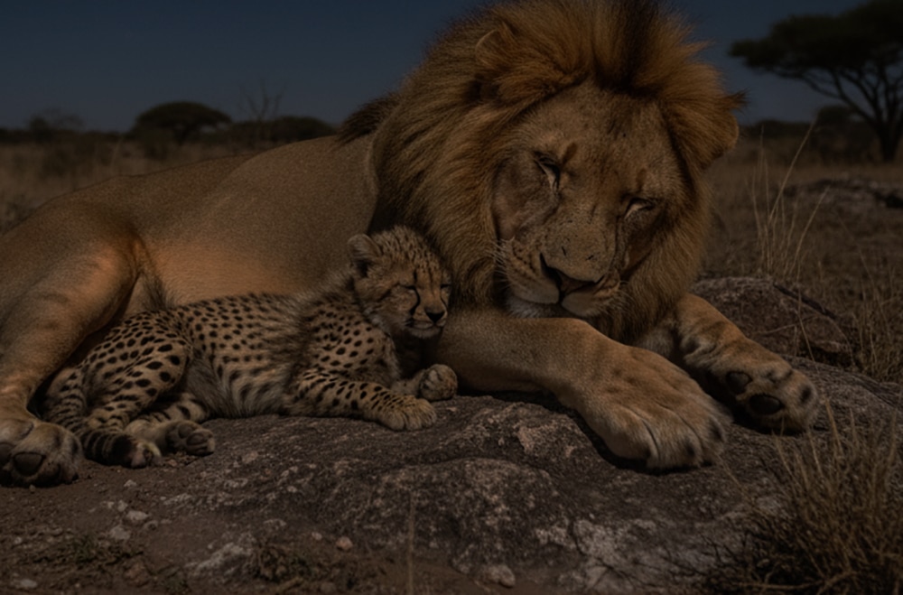 Under Leo’s protection, the tiny cheetah flourished. He curled around her every night, making sure she was warm and safe.