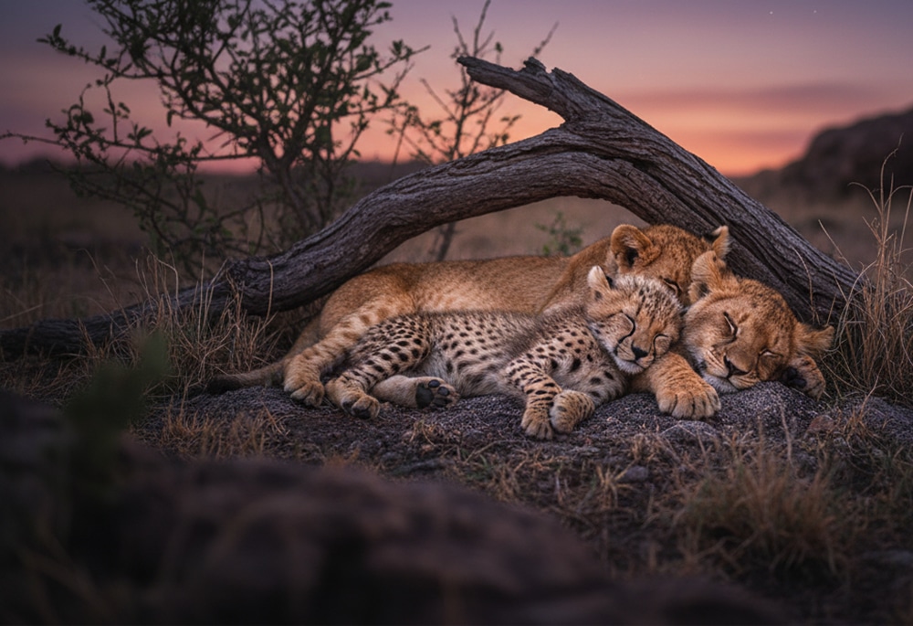 Together, lions and cheetah rested under the darkening sky, safe and calm. It wasn’t the family anyone expected, but it was a real one.