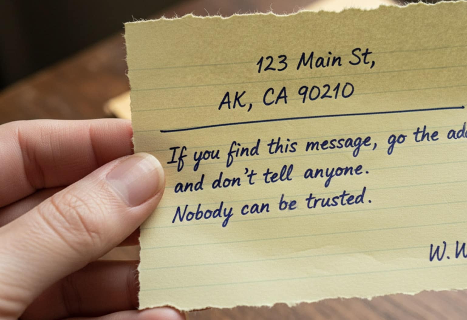 And below it was a message: “If you find this message, go to the address, and don’t tell anyone. Nobody can be trusted.” The note was signed at the bottom with the initials W.W.