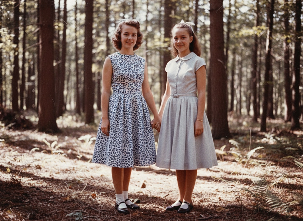 It showed Grandma Willow wearing the blue and white prom dress. She stood in a forested area, with another girl of the same age standing next to her.