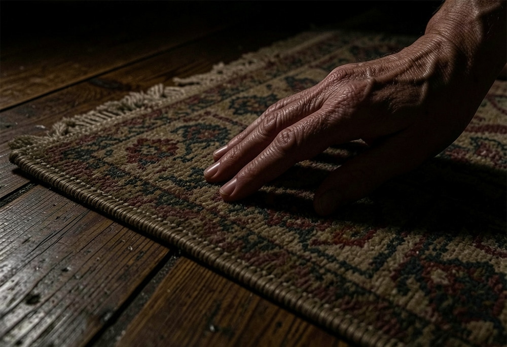 Her heart beat faster as she knelt down and gripped the edge. With a strong pull, she tugged on the fabric as it folded back toward her.