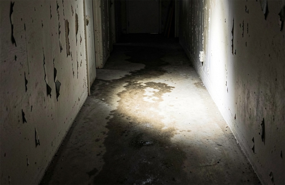 The flashlight illuminated the corridor ahead while her friends gathered there, looking around in disbelief at the hidden space beneath the house.