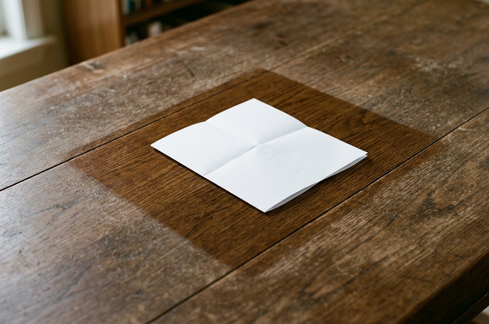 As he moved closer to the table, he noticed a small object resting on it. It was a folded piece of paper, placed carefully in the middle.
