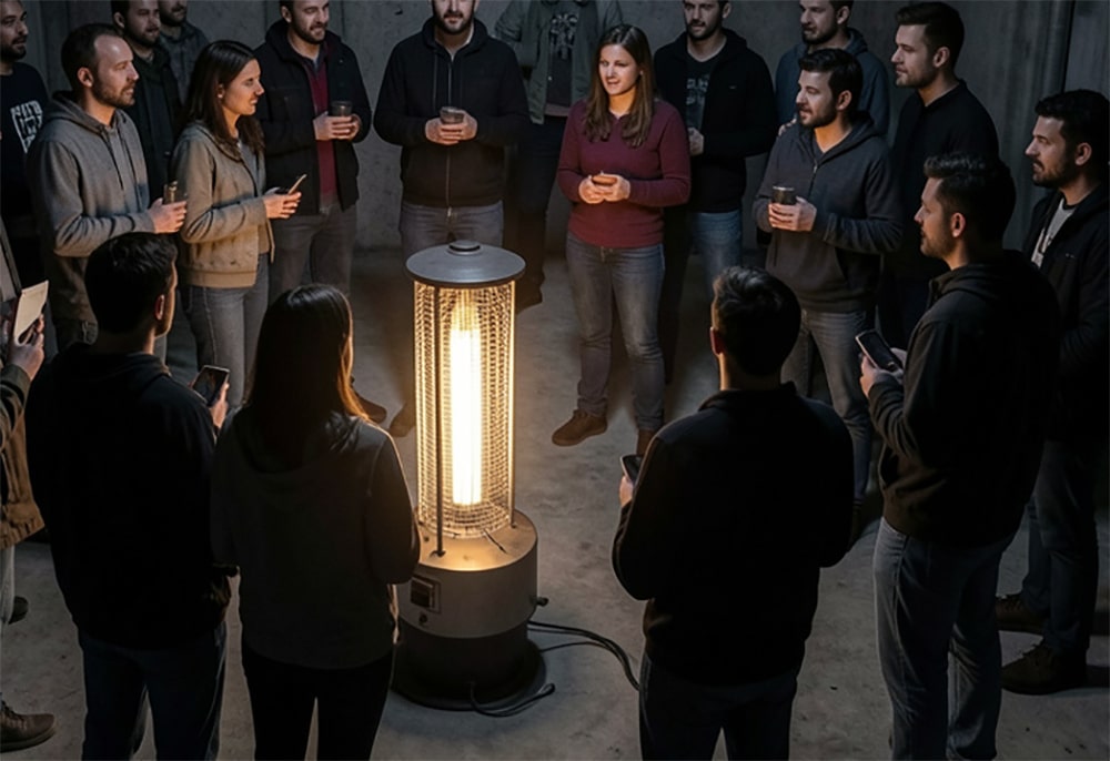 As she rounded the final corner into the main space, the scene opened up in front of her. At least thirty people were gathered in a large underground room, sitting and standing around a central heat source.