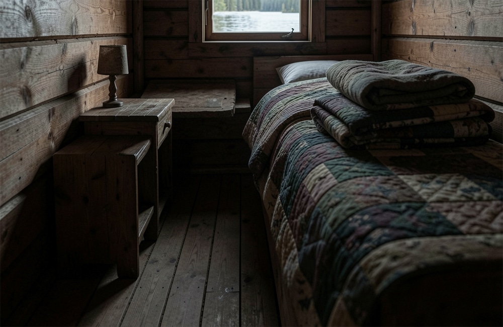 Behind it was a small sleeping area with a narrow bed, a nightstand, and a little window looking out over the water. A quilt was folded at the foot of the bed.