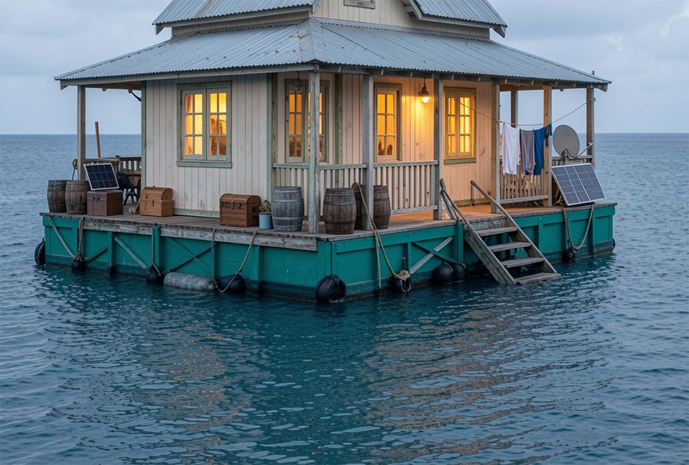 A narrow wooden deck wrapped around the front, and an old rope was tied to one of the posts.