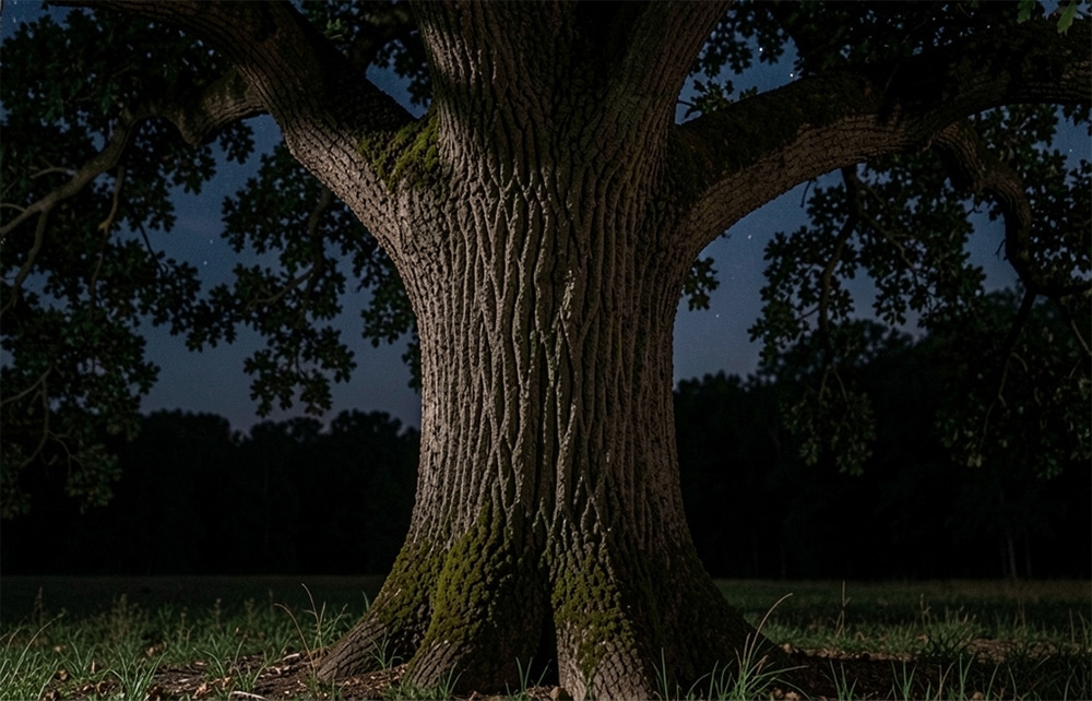 His path brought him closer and closer to the oak tree. The movement became more focused with each step, the zigzag pattern tightening as if he was closing in on something.
