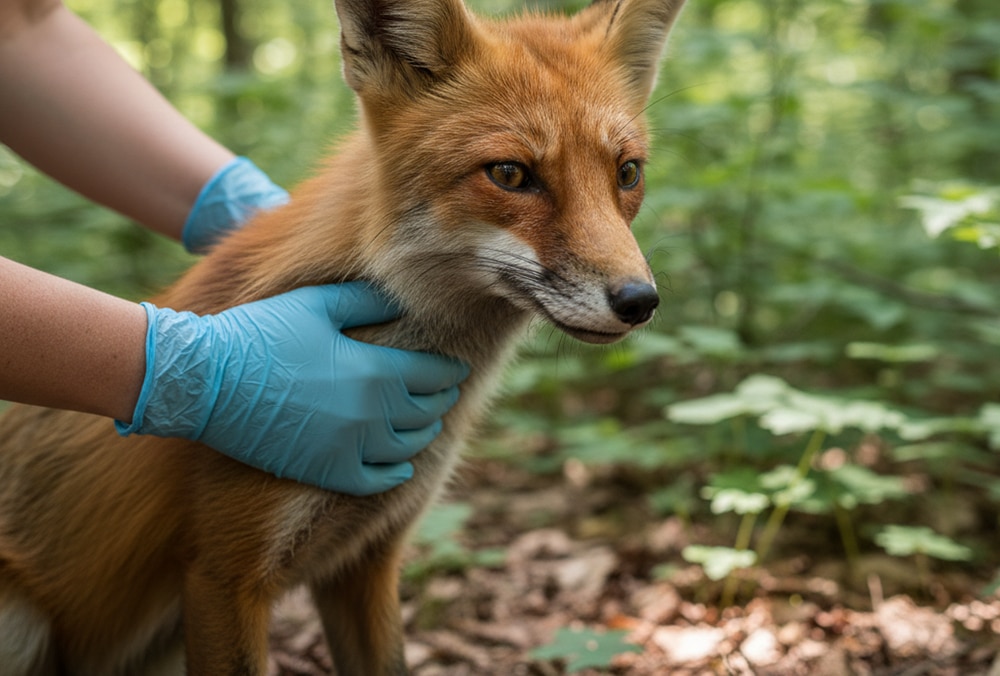 Dr. Blom stepped forward quickly and assessed the fox without delay. She confirmed the animal was alive but weak, with a likely injured paw and signs of dehydration.