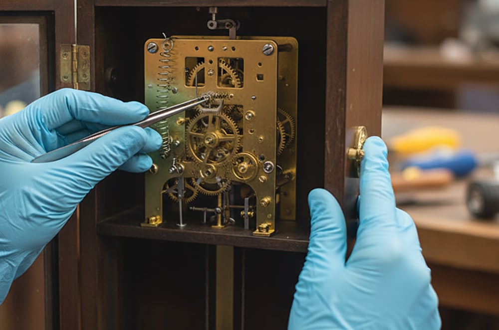 Rita carefully opened the long front panel to access the pendulum and weights inside. The interior smelled of old wood and machine oil — familiar and comforting. She examined the movement first, noting its unusual construction.