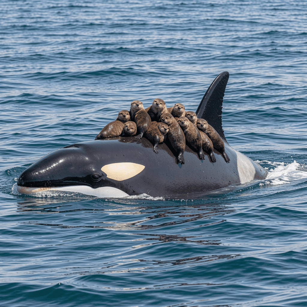 Carefully, they began placing rescued otters onto the orca’s broad back, where they clung instinctively, forming a living bundle that the animal carried without resistance or hesitation.