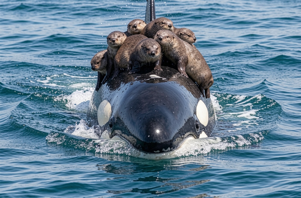 One by one, the added otters settled across its back, gripping tightly, forming a fragile living raft that moved in quiet cooperation with the rescuers nearby.