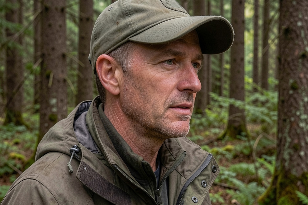 His eyes swept the tree line in a slow, careful arc, stopping on every shadow and gap between the pines. Maya pressed her back against the trunk and held her breath.