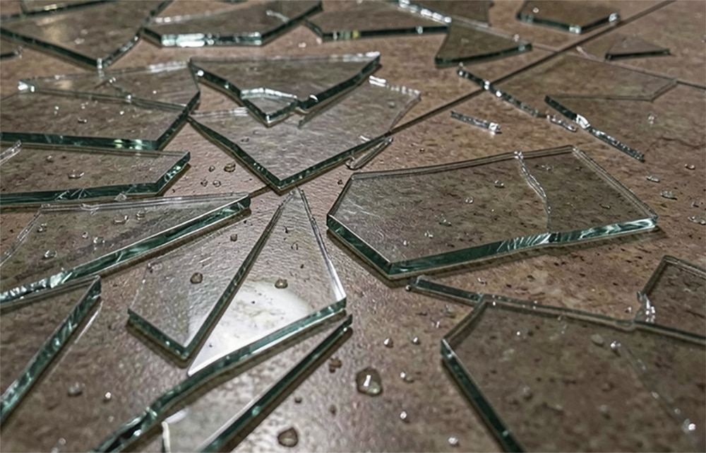 As he got closer, he noticed that a small glass panel inside the wooden door was shattered. And there were jagged glass shards all over his kitchen floor.