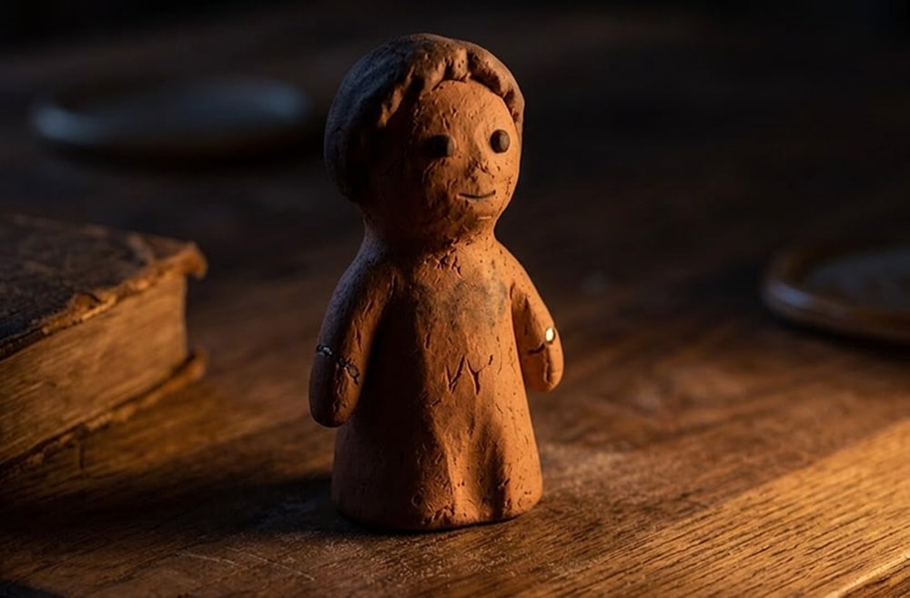 The clay figurine still stood on the table beside the carved symbols. He picked it up carefully, holding it for a brief second before heading back outside to the waiting man.